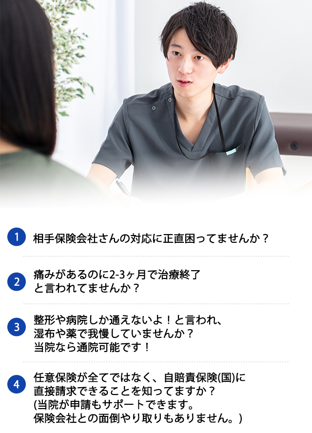 あなたの状況をしっかりお聞きして交通事故専門の当院が